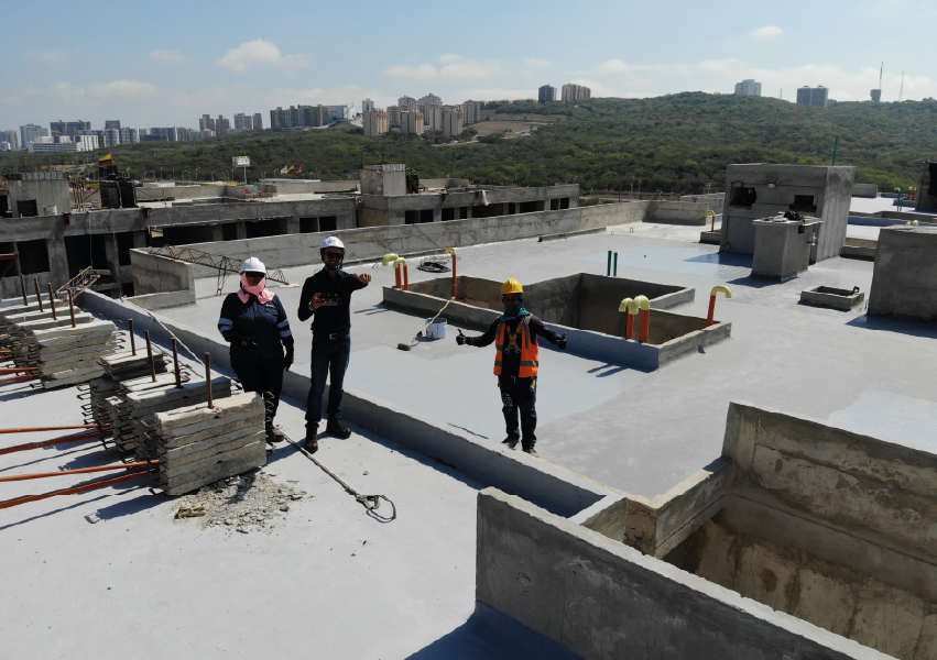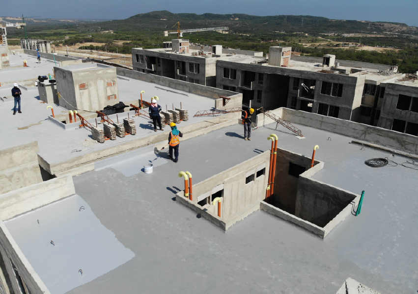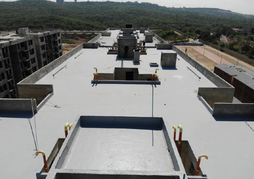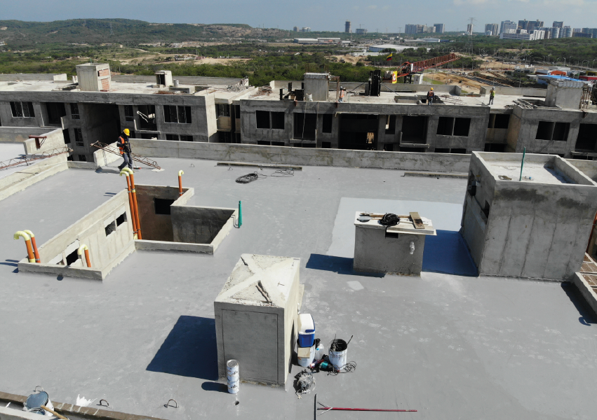 Utilizamos un sistema de Poliurea Fría reforzada con filtro UV, logrando ese acabado gris uniforme y limpio que se ve en la foto. Más allá de la estética, este sistema ofrece una «piel» elástica que soporta los movimientos del edificio y el clima extremo sin cuartearse.